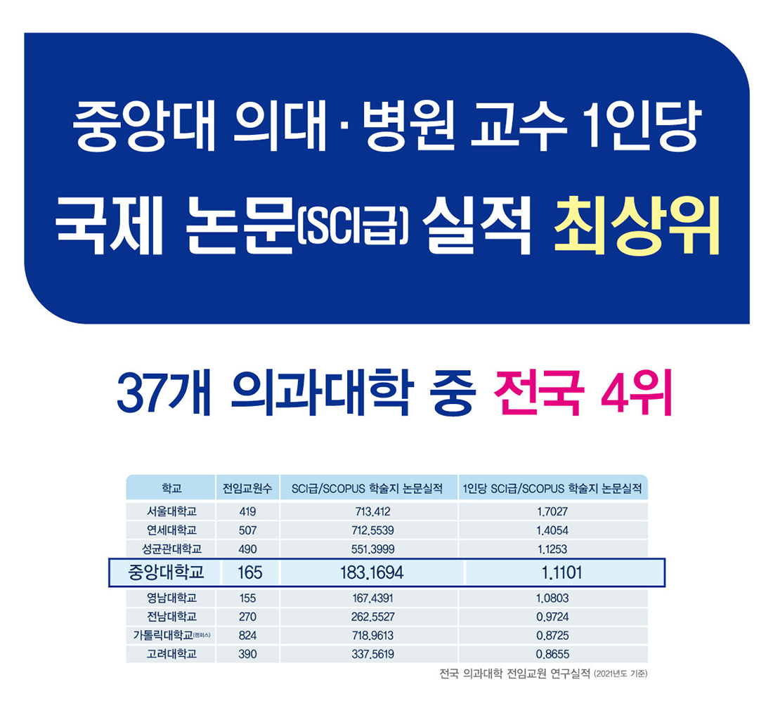 중앙대 의대․병원이 교수 1인당 SCI급/SCOPUS 학술지 게재 논문 실적 공시 자료(의학과 기준)에서 전국 4위에 오르는 저력을 과시했다. 최근 대학알리미에 공개된 ‘2021년 대학정보공시 자료’를 비교 분석한 결과 중앙대 의대 전임교원 1인당 SCI급/SCOPUS 학술지 게재 논문 수는 1.11건으로 서울대 1.70건, 연세대 1.40건, 성균관대 1.12건에 이어 우수한 연구 성과를 증명했다.
